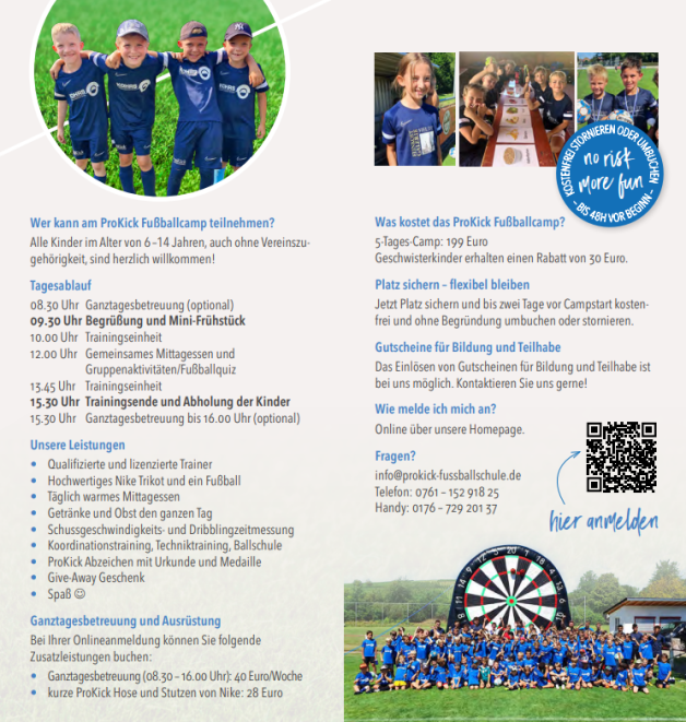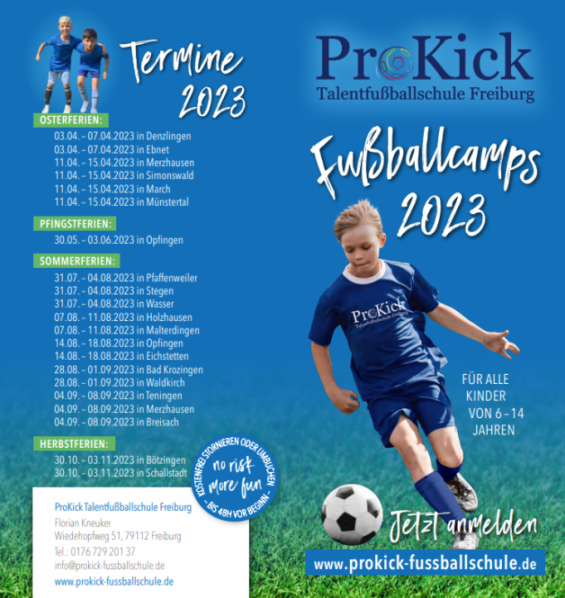 auch im kommenden Jahr kommt das ProKick Sommerfußballcamp wieder zu uns nach Pfaffenweiler. Vom 31.07.-04.08.2023 wird die ProKick Fußballschule wieder fünf Tage lang von 9.30-15.30 Uhr Kinder zwischen 6-14 Jahren trainieren und mit viel Spaß